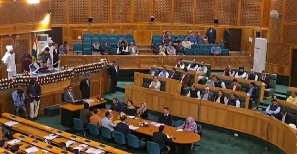 इस पर NC और कांग्रेस के विधायकों ने जमकर विरोध किया, मेज़ें थपथपाईं, और नारेबाजी शुरू हो गई।