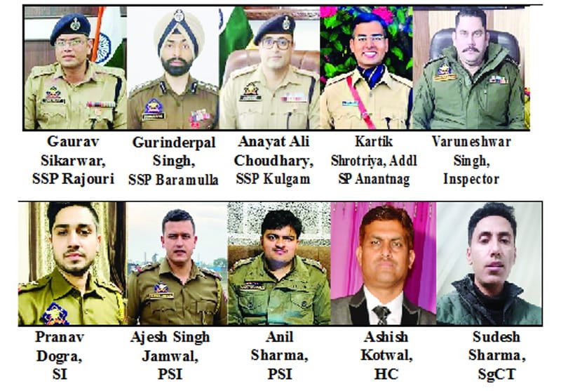 Prominent among them are Additional SP Baramulla Hari Prasad KK, Additional SP Anantnag Kartik Shrotriya, SP Ops Border and Kandi Kathua Mukund Tiberwal, SDPO Nehru Park Vaibhav Meena, SP SOG Srinagar Tanveer Ahmed Dar, Additional SP Bhaderwah Vinod