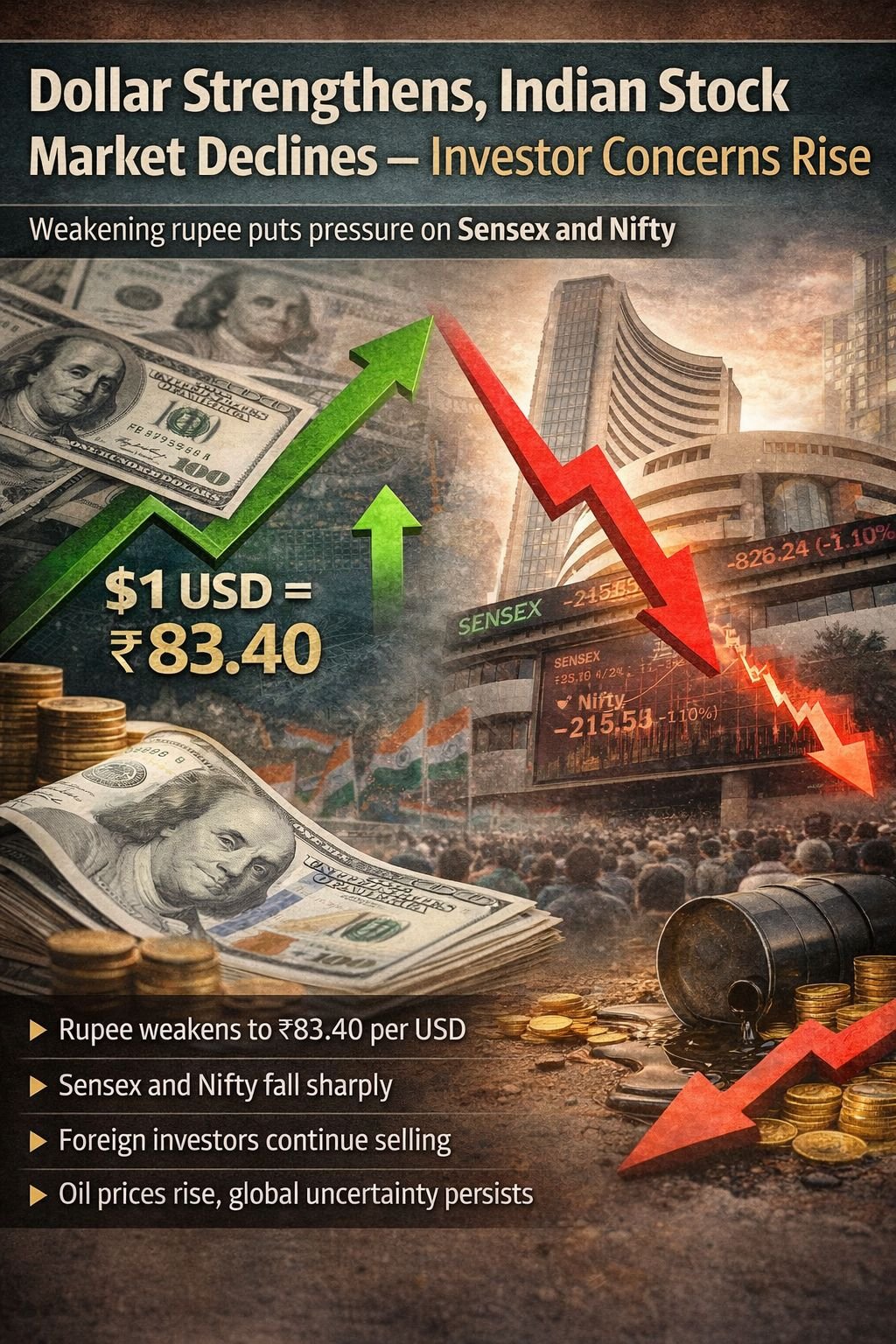 The Indian financial markets witnessed a volatile session today, as the US Dollar strengthened while the domestic stock market ended on a negative note. The combined impact has raised concerns among investors and market participants.