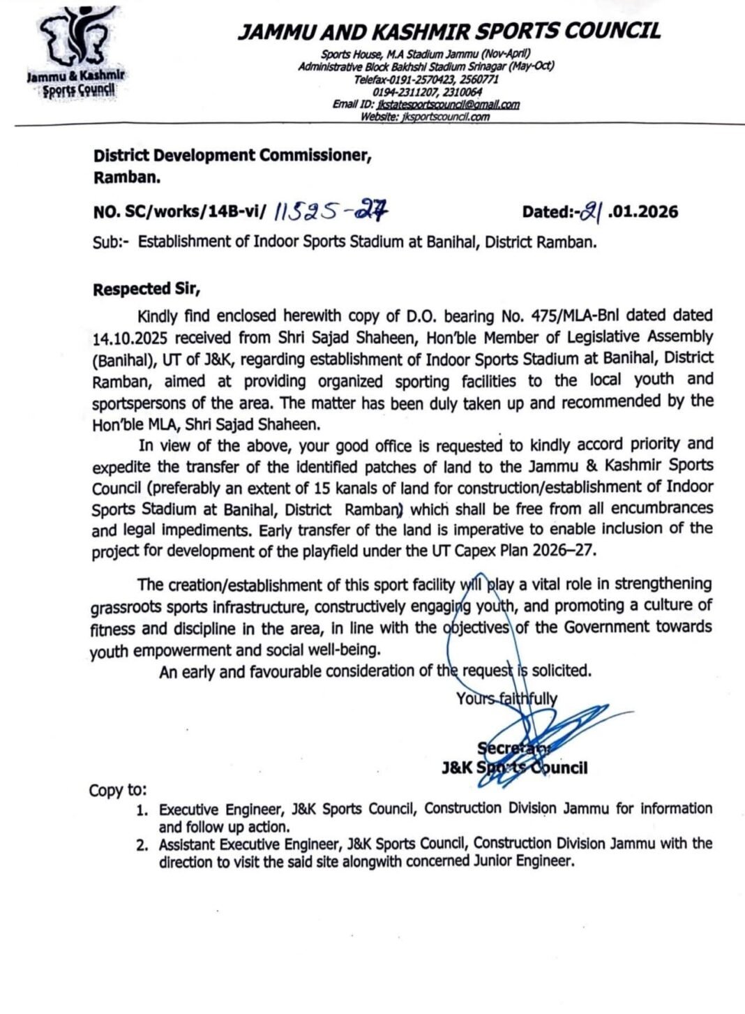 I am pleased to share that the proposal for establishment of an Indoor Sports Stadium at Banihal, has been formally taken up by the Jammu & Kashmir Sports Council. The matter has progressed at the official level, and the District Administration has been requested to expedite transfer of identified land.