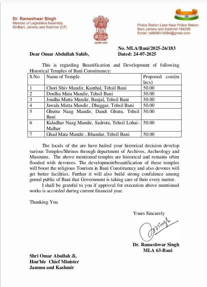 Dr. Rameshwar Singh, MLA from Bani constituency in Jammu and Kashmir, has put forward a comprehensive proposal seeking the beautification and development of several historical temples in the region. The proposal was formally submitted to the Chief Minister, Omar Abdullah, highlighting the urgent need to preserve and upgrade these culturally significant religious sites.According to the proposal, seven key temples across the Bani constituency have been identified for development, with an estimated allocation of ₹50 lakh for each site, bringing the total projected cost to ₹3.5 crore. The temples included in the plan are Chori Shiv Mandir (Kanthal), Doulha Mata Mandir, Joudha Mata Mandir (Banjal), Jwala Mata Mandir (Dhaggar), Ghuttu Naag Mandir (Dandi Ghuttu), Kaladhar Naag Mandir (Sadrota, Lohai-Malhar), and Ghad Mata Mandir (Bhandar).In his communication, the MLA emphasized that these temples are deeply rooted in the region’s religious heritage and historical identity, attracting a steady flow of devotees from nearby areas as well as other parts of the Union Territory. Despite their importance, many of these sites currently lack adequate infrastructure such as proper access roads, sanitation facilities, resting areas, and organized premises for pilgrims.He noted that the proposed development would not only enhance the aesthetic appeal of these temples but also ensure better management of pilgrim footfall, especially during peak festive seasons when the number of visitors increases significantly. The plan is expected to include improvements in basic infrastructure, cleanliness, landscaping, and possibly the creation of visitor-friendly amenities.Furthermore, Dr. Rameshwar Singh pointed out that such an initiative would play a crucial role in boosting religious tourism in the Bani region, which has long remained an underexplored destination despite its rich cultural assets. Increased tourist inflow, he added, could generate new livelihood opportunities for local residents, benefiting small businesses, shopkeepers, and service providers.The proposal also underlines the importance of government support in preserving heritage structures, stating that timely intervention would strengthen public confidence and demonstrate the administration’s commitment to regional development. The MLA has urged the Chief Minister to grant approval for the project within the current financial year, enabling early commencement and execution of the work.Conclusion:The proposed temple development plan reflects a broader vision of combining heritage conservation with economic growth. If approved, the initiative could transform Bani into a prominent religious tourism hub while simultaneously improving infrastructure and quality of life for local communities. All eyes are now on the government’s response to this proposal, which carries both cultural and developmental significance for the region.
